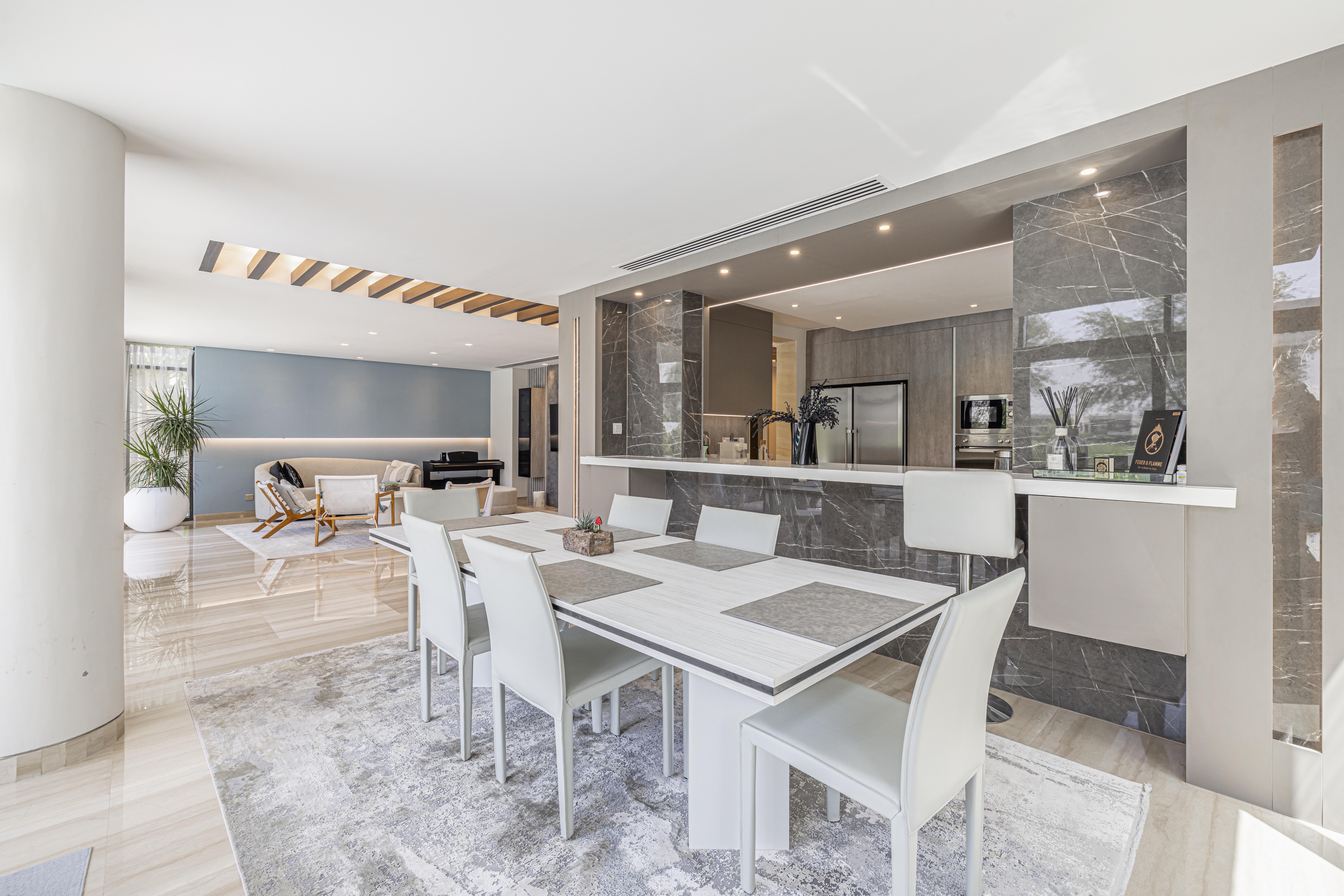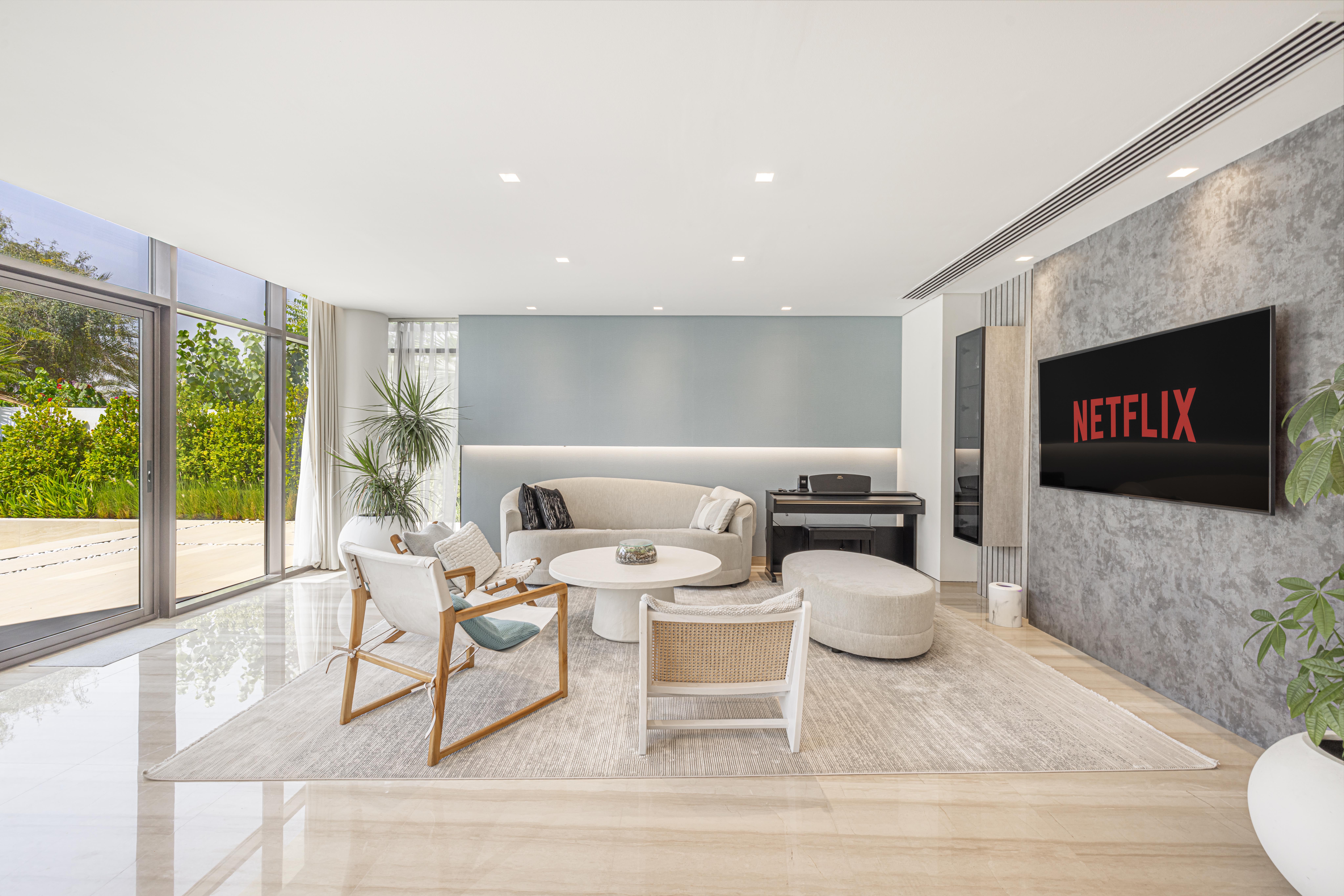 The villa interiors were designed to reflect modern luxury with a calm, elegant atmosphere. Marble walls and high-end cladding elements add architectural depth, while custom flooring creates a seamless flow throughout the villa.